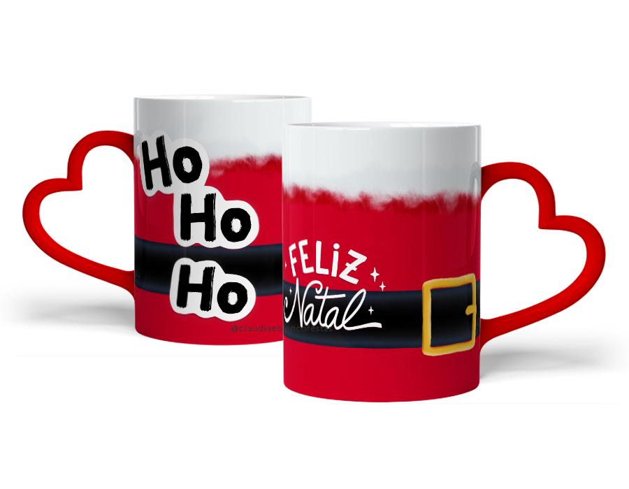 CANECA EM CERÂMICA NATALINA ALÇA DE CORAÇÃO - HOHOHO FELIZ NATAL