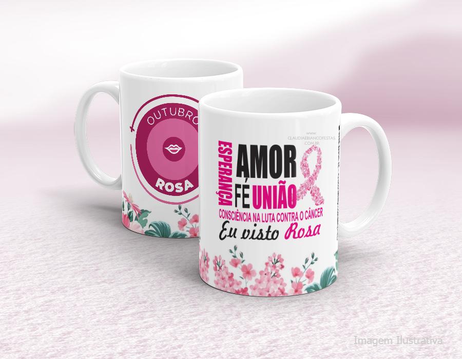 CANECA EM CERÂMICA OUTUBRO ROSA - AMOR, FÉ, UNIÃO...