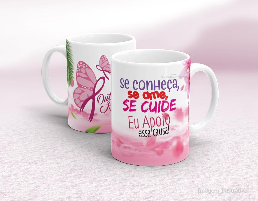 CANECA EM CERÂMICA OUTUBRO ROSA - SE CONHEÇA, SE AME, SE CUIDE