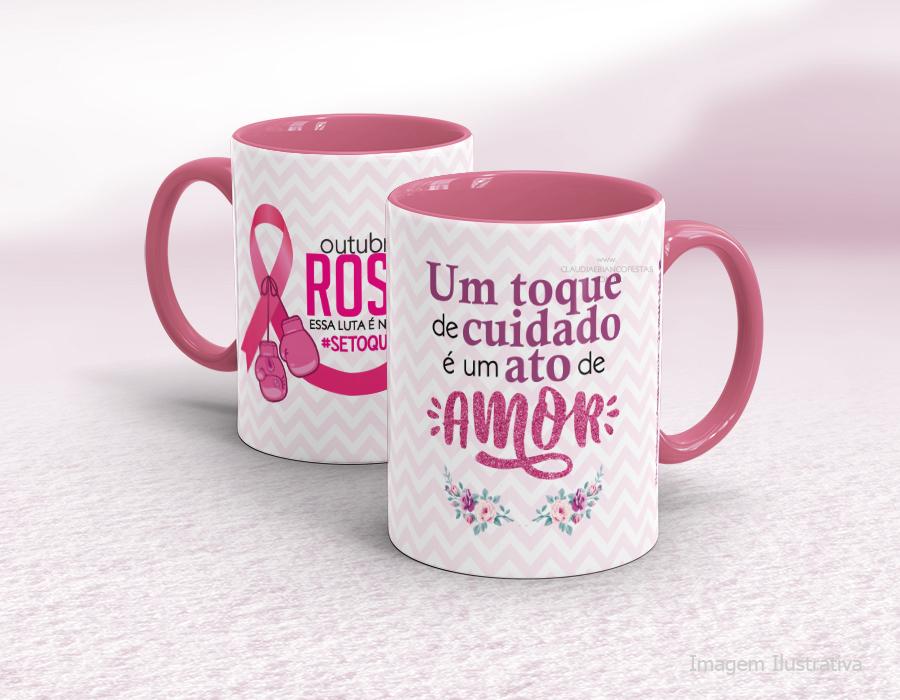 CANECA EM CERÂMICA OUTUBRO ROSA - UM TOQUE DE CUIDADO É UM ATO DE AMOR