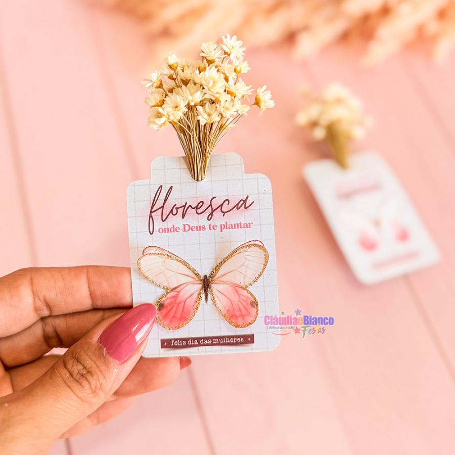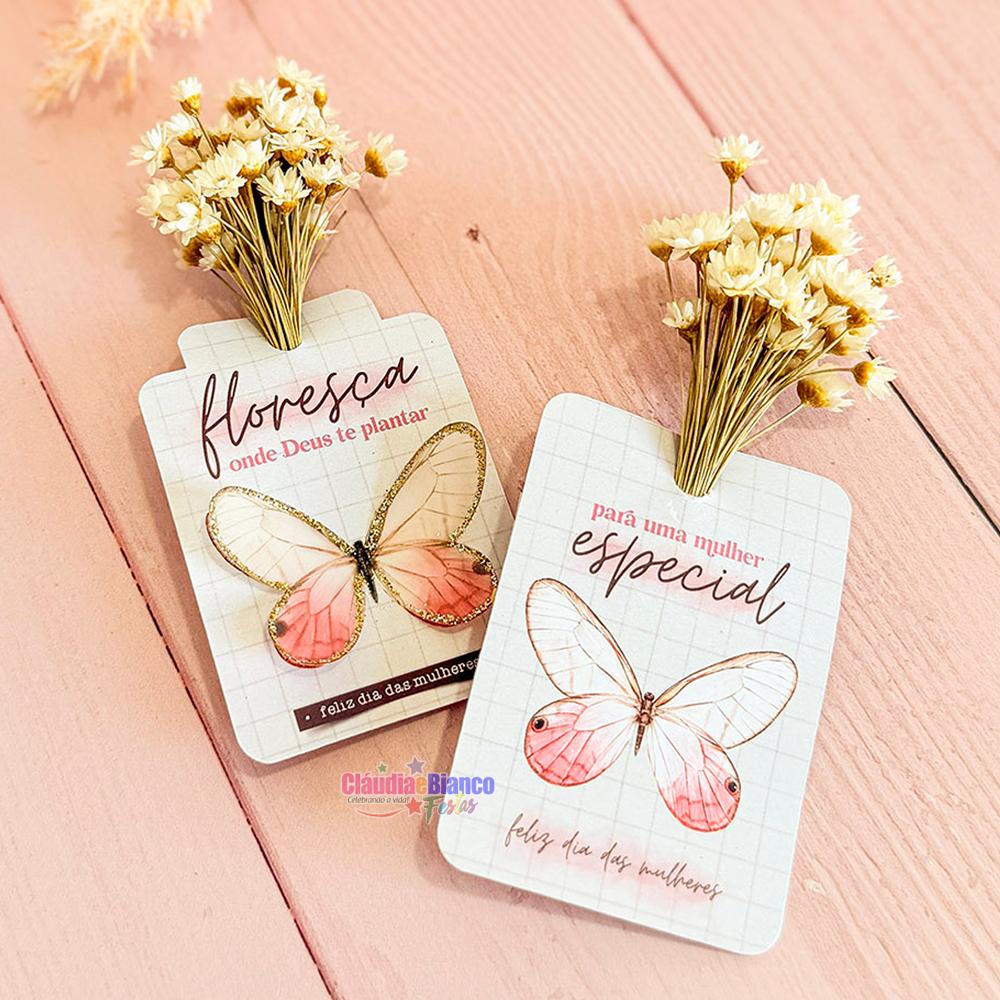 CARTÃO BORBOLETA 3D DOURADO FLORZINHA SEMPRE VIVA LEMBRANCINHA DIA DA MULHER