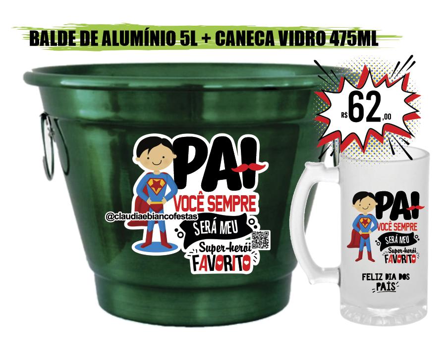 KIT BALDE DE GELO EM ALUMÍNIO + CANECA DE VIDRO JATEADA DE 475ML - VOCÊ SERÁ SEMPRE MEU SUPER-HERÓI FAVORITO