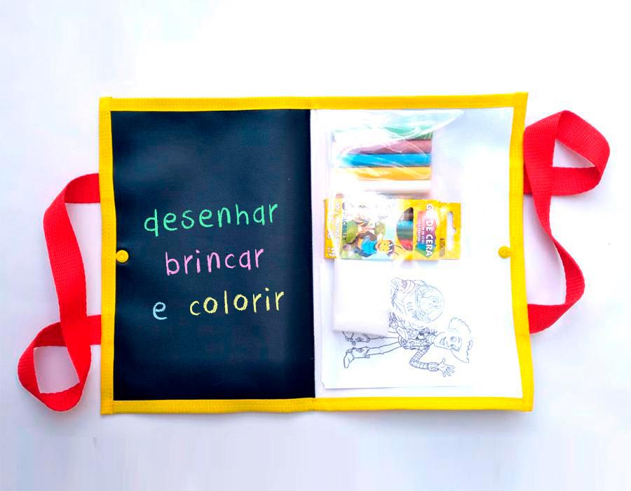 Acompanha giz de lousa, esponja para apagar, giz de cera, folhas para colorir.