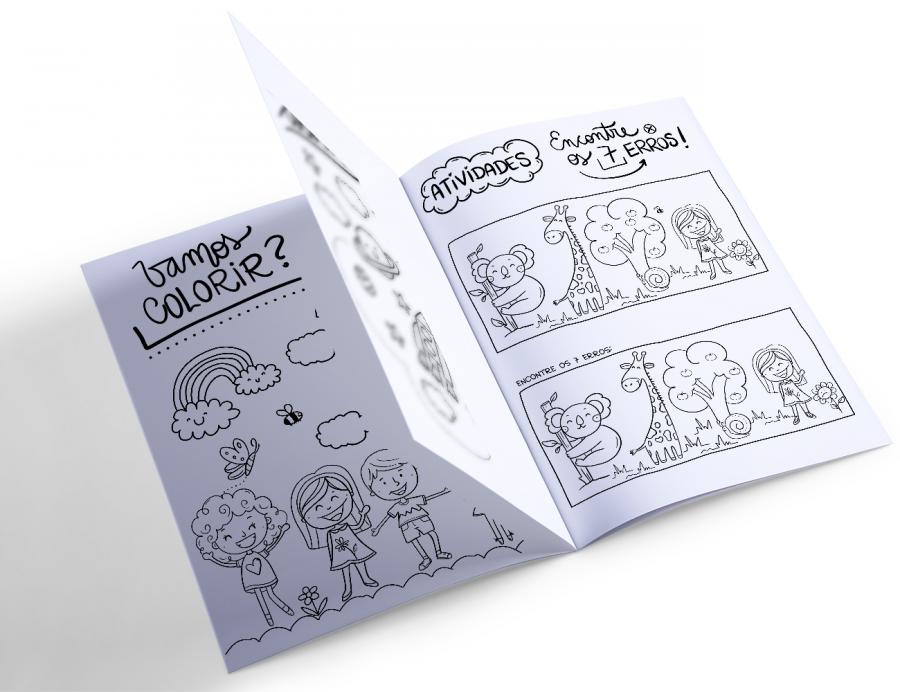 Revista colorir e brincar, com atividades como jogo dos 7 erros, caça-palavras, ligar pontos, labirinto dentre outras, atividades de colorir.
